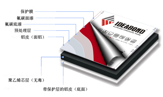 雅達利氟碳系列產品由以經過化學處理的涂裝鋁板為表層材料,用聚乙烯塑料為芯材,在專用鋁塑板生產設備上加工而成的復合材料。氟碳涂料具備出色的耐候性能,通過輥涂工藝然后應用于鋁塑板上,其獨具的特性能使板材具備出色的耐太陽輻射能力,能抵御各種天氣狀況以及受到工業化污染的環境。這些優異特性的歸功于抗紫外線粘結材料以及氟碳涂料的采用。